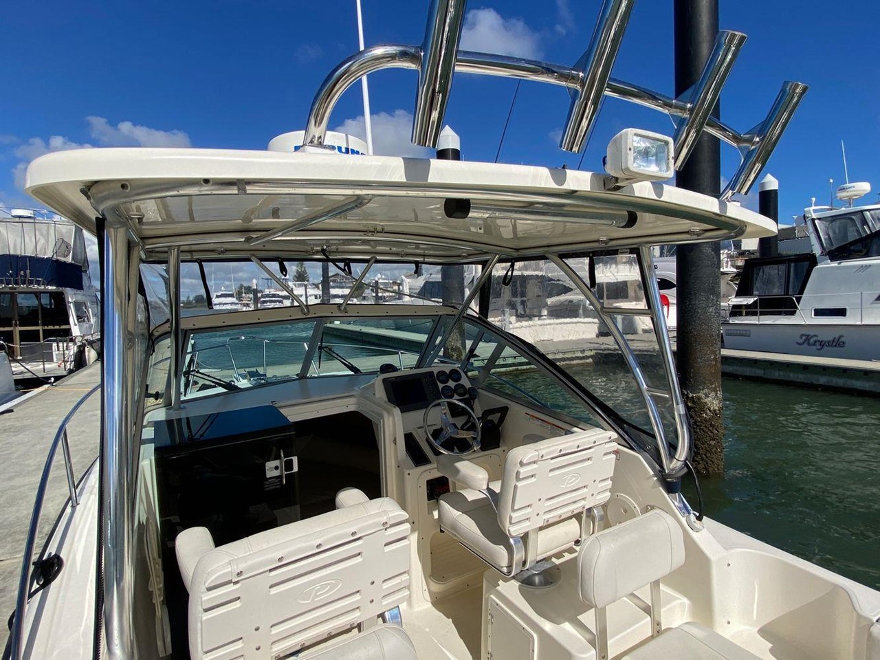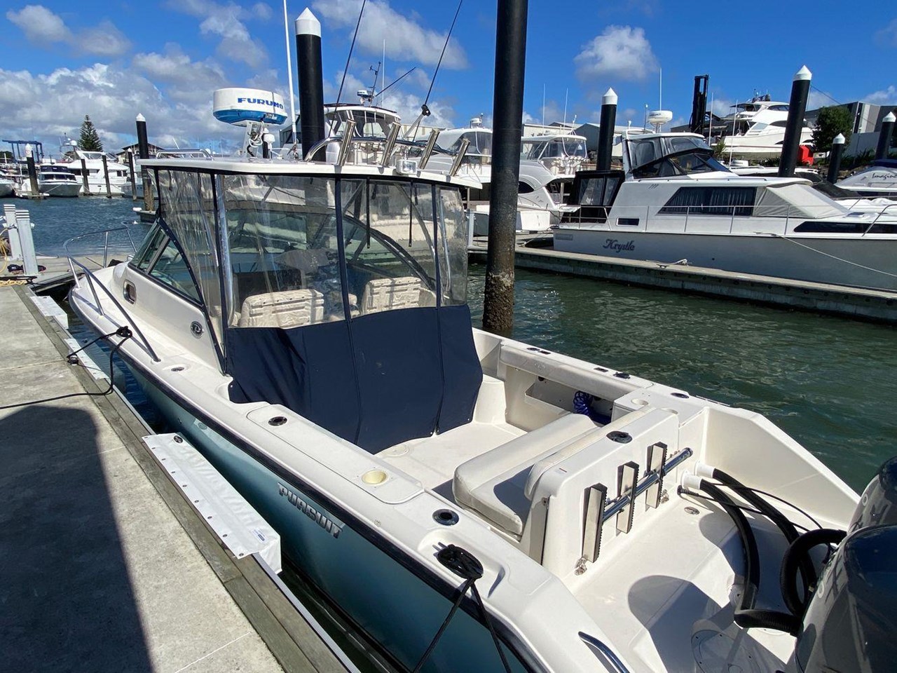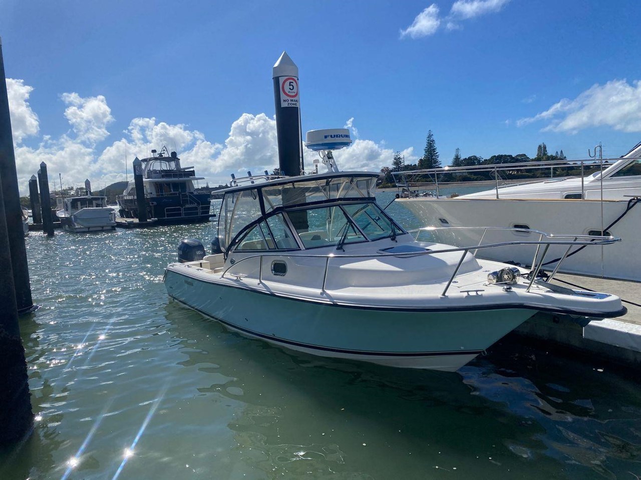 Powered by Twin Yamaha Fourstroke 150HP outboards with 562 hours on the clock. On Launching trailer (not road legal) Take advantage of this well-maintained, practical, twin-engine day boat, which is set up for a great day on the water for fishing. Featuring a clean and easy-to-move-around deck area, comfortable seating and shelter provided from both the clears and hard top, this boat is primed and ready for your next adventure. The hinged aft seat with fish box/coolbox, transom door, and bolsters around the deck make it a safe yet practical area. The forward cabin comfortably sleeps two. Opening port lights, interior lighting, a marine toilet, and a sink complete this area. Specifications: LOA w/ Pulpit: 8.31m Beam: 2.67m Draft (Motor Down): 0.71m Approx Dry Weight: 2,767kg Fuel Capacity: 492L Fresh Water Capacity: 75.7L Deadrise: 21 Degrees Ask about our competitive finance rates, we can tailor a package to suit most budgets to approved purchasers. Nationwide delivery is available. Sports Marine has over 100 boats for sale in Christchurch, Auckland & Sydney. We've been selling quality new & used boats for over 45 years. With over 8,000 boats sold, you can count on us for great deals and quality after-sales service & support. This boat is on display and ready for inspection now at Sports Marine Auckland. Twin Yamaha Four Stroke 150HP outboards Hard Top with Clears Lewmar Anchor Winch Transom gate Rod holders Bolsters Sink with freshwater Flip up aft seat with removable bin Furuno Radar VHF radio Fusion Sound System 75L Freshwater tank Head with holding tank Comfortable V-Berth