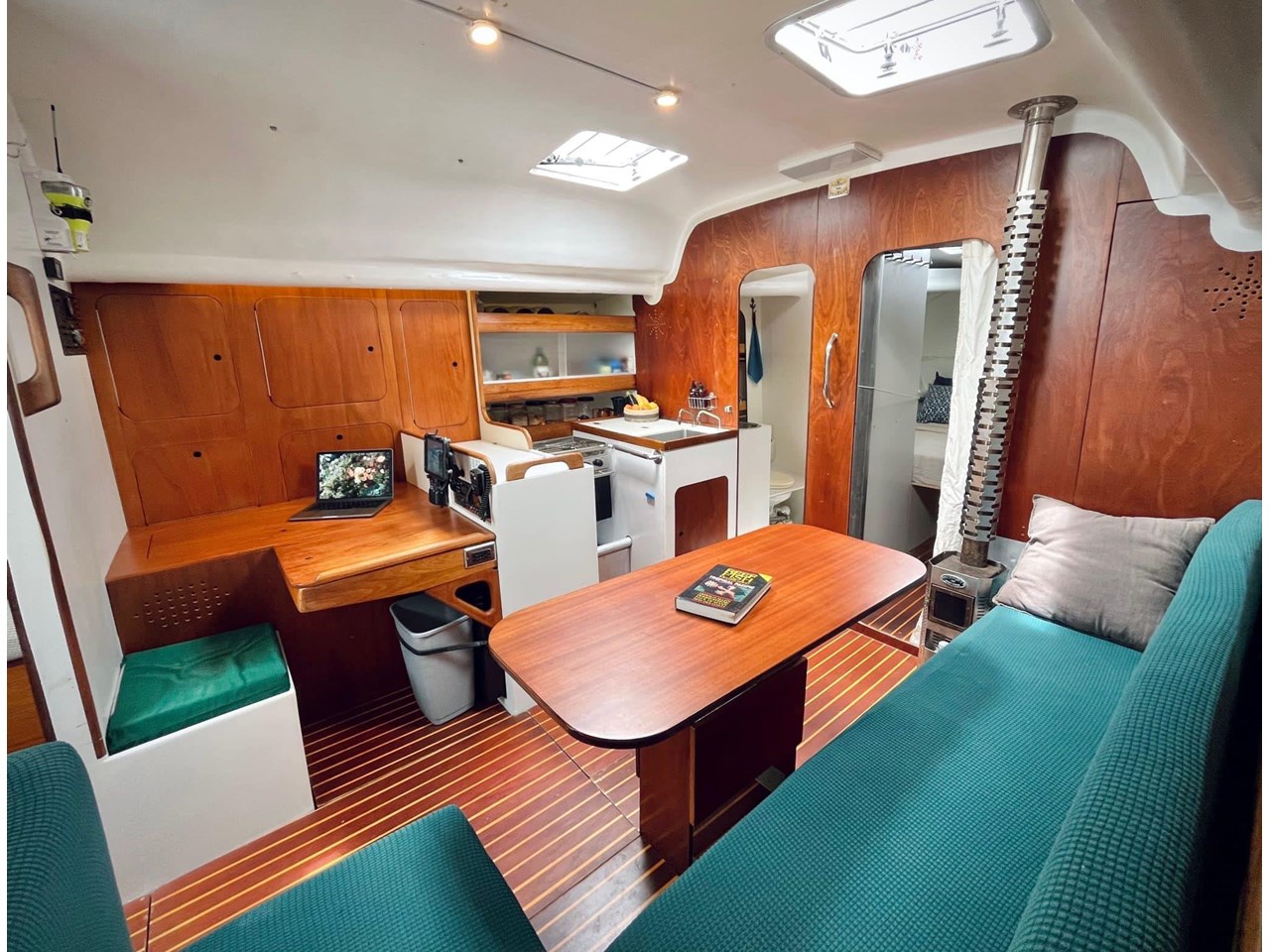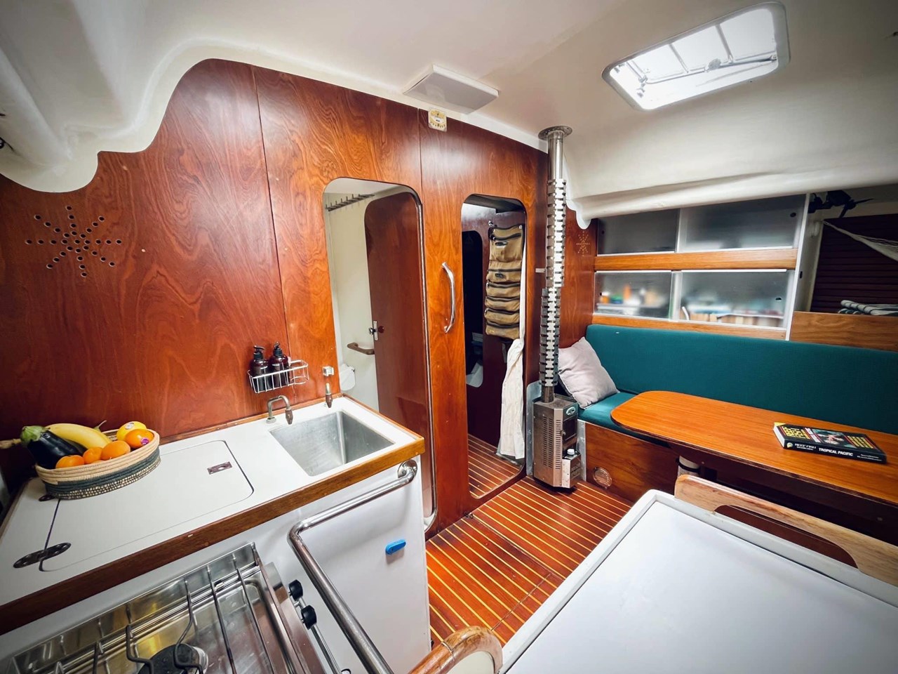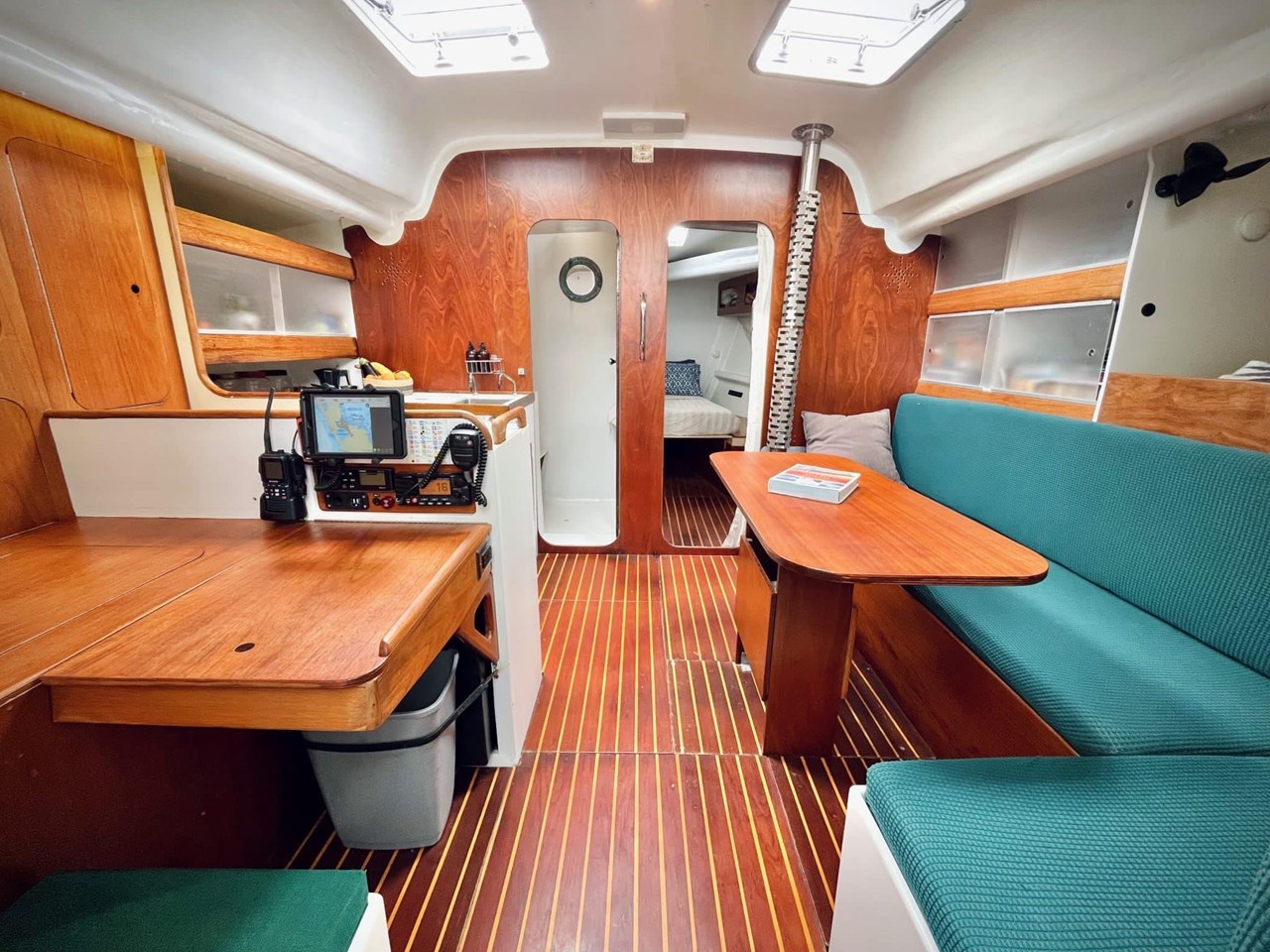 Step down into the main saloon. The galley is located on the port side and is well-equipped. There is a three-quarter berth on starboard aft and a large V-berth forward. A single berth on the settee completes the accommodation.