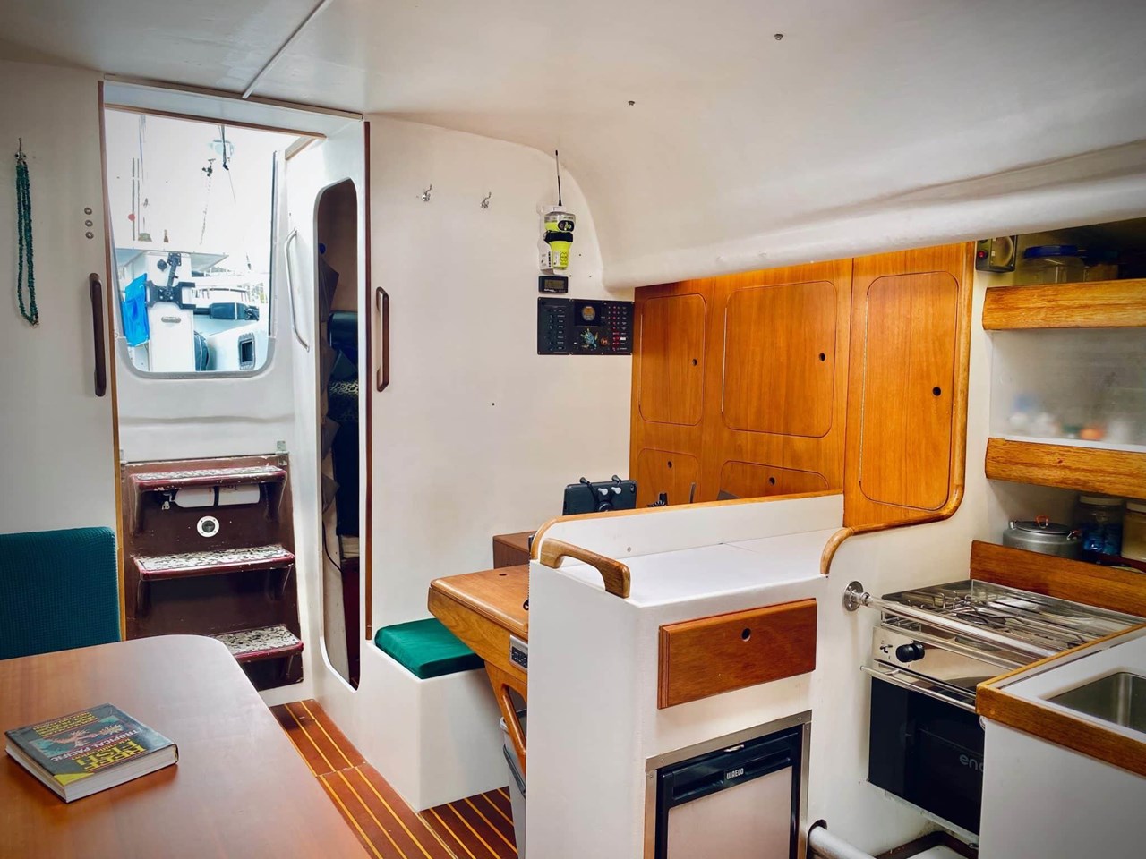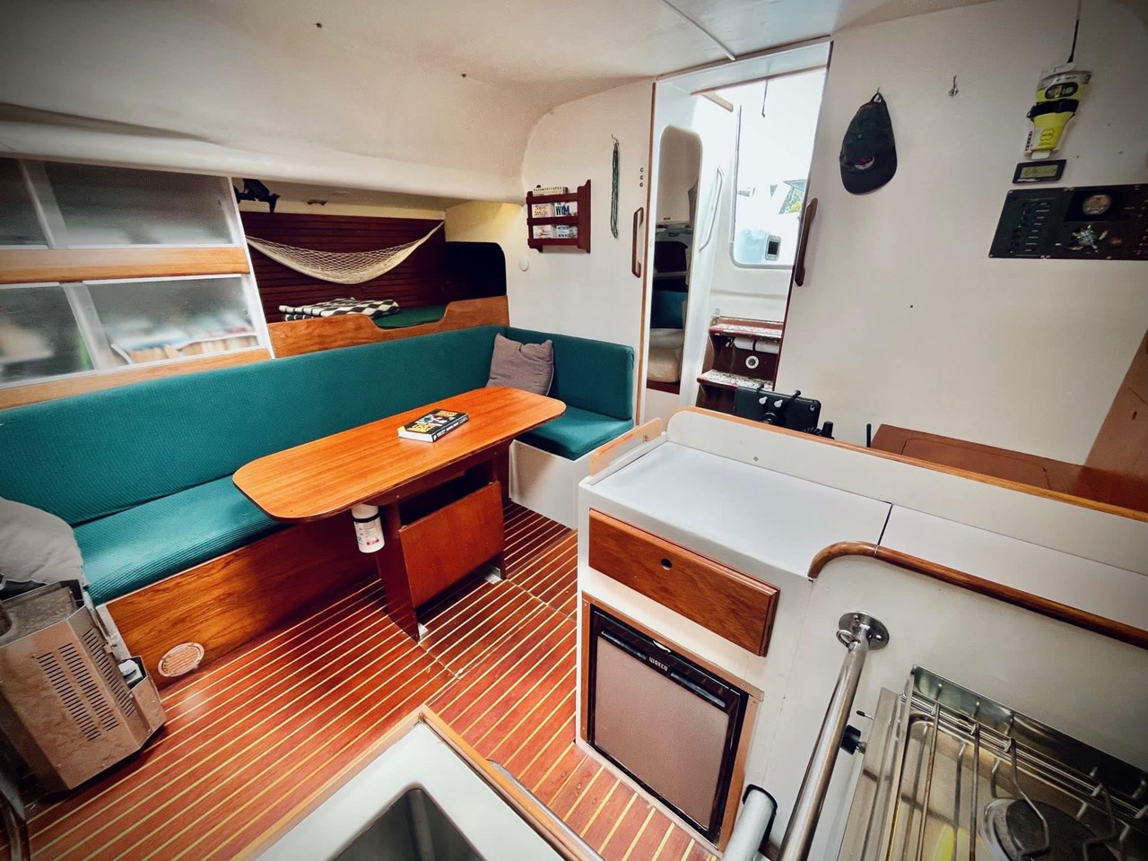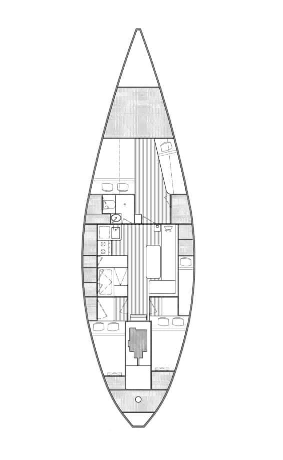 Step down into the main saloon. The galley is located on the port side and is well-equipped. There is a three-quarter berth on starboard aft and a large V-berth forward. A single berth on the settee completes the accommodation.