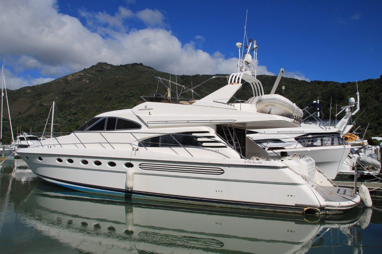 Luxury Large Volume Sports Cruiser by Fairline Yachts (UK), Twin MANN 900hp diesel engines, cruises 10 to 18 knots, max 24 knots.