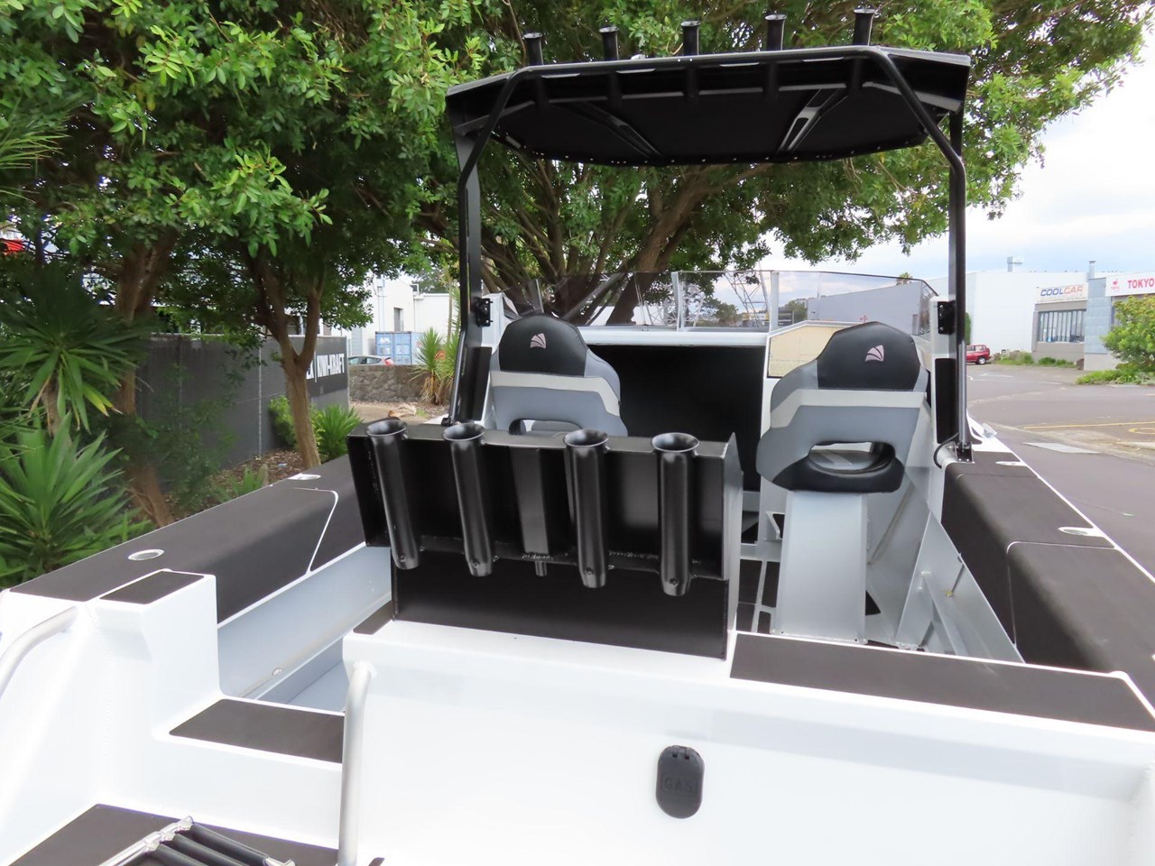 Upgrade options including: Bait board with 4 Rod Holders - Powder Coated Black.... Bimini Top for Cuddy - Folding - Canvas Top - Rocket Launcher .... Boarding Ladder Dive.... King / Queen Seat upgrade to fit chilly bin (each).... U-Deck Basic Flooring Cockpit.... U-Deck Basic Gunwale / Swim Step.... Painted Hull Sides Solid (A).... Painted Gunwale, Transom & Cabin Top Solid (B).... Engine Upgrade to Mercury 150hp.... VHF Radio/Aerial/Fitting.... Echo Map UHD 95SV.... Upgrade to Hydraulic disc brakes one axle (S/S hoses and Callipers)....