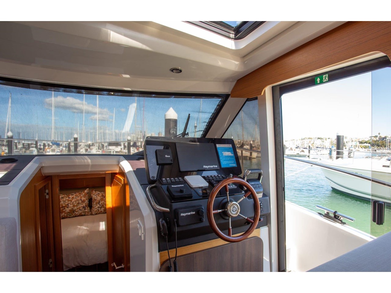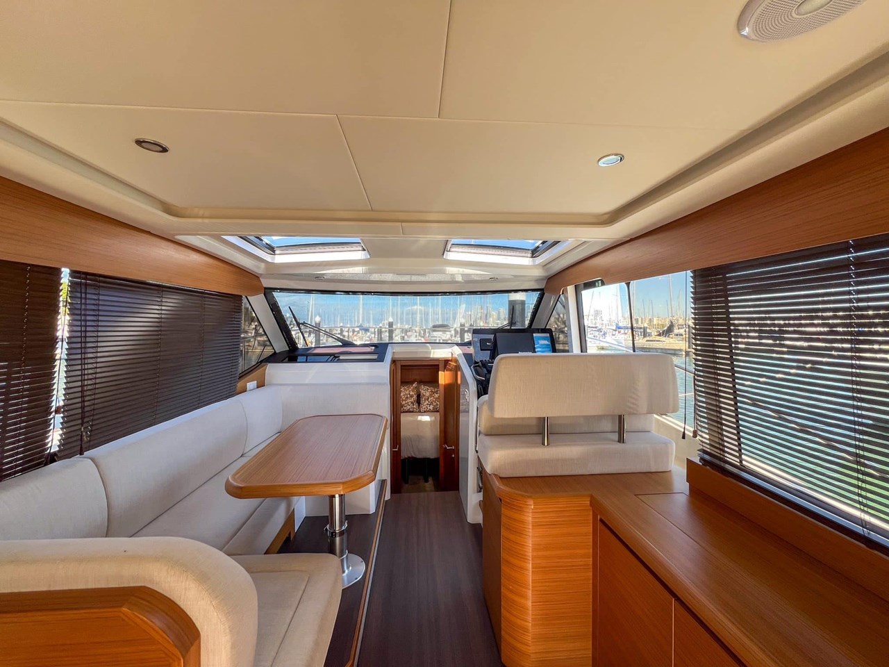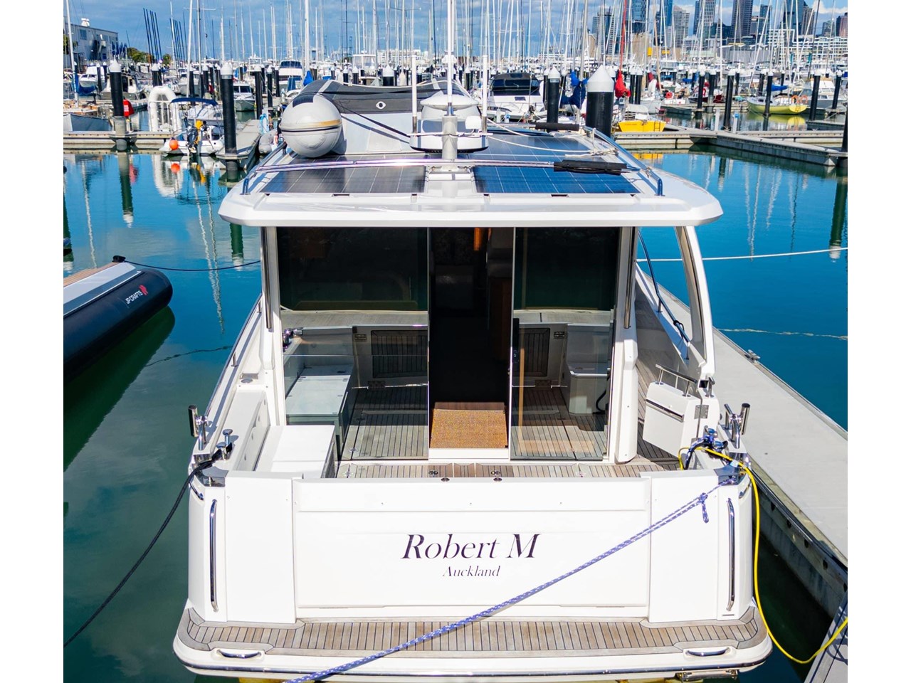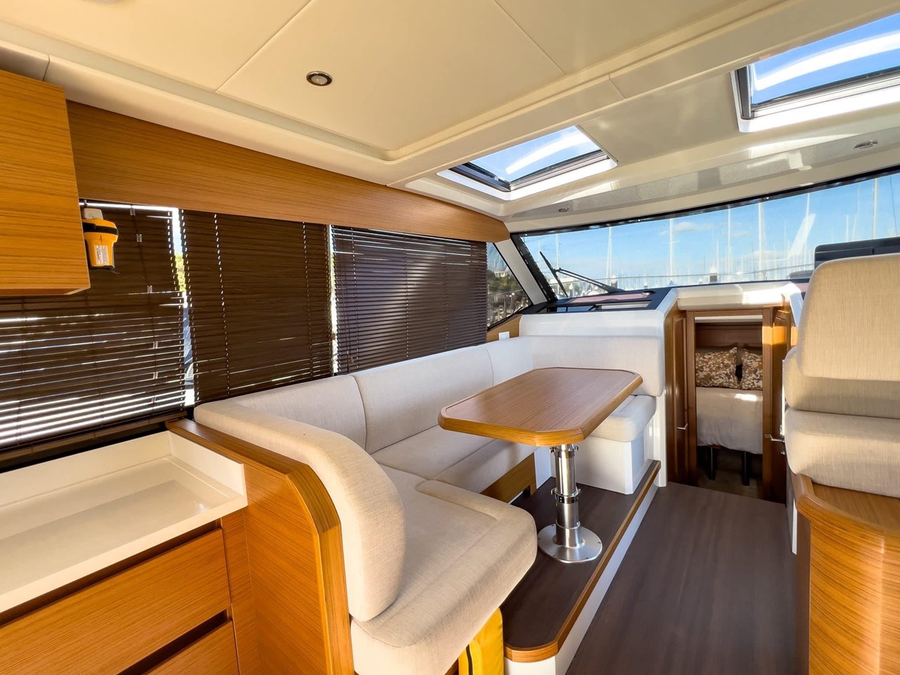 Step inside to find a bright and airy interior, where large wraparound windows flood the space with natural light. Clever design elements maximize functionality, including a folding benchtop that transforms into a bar, a lowering transom that serves as a swim platform, and abundant storage options throughout the vessel.