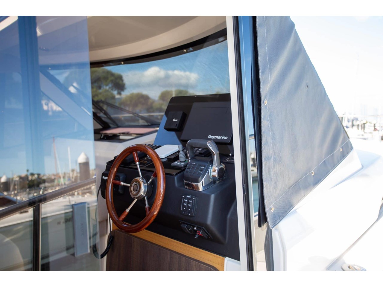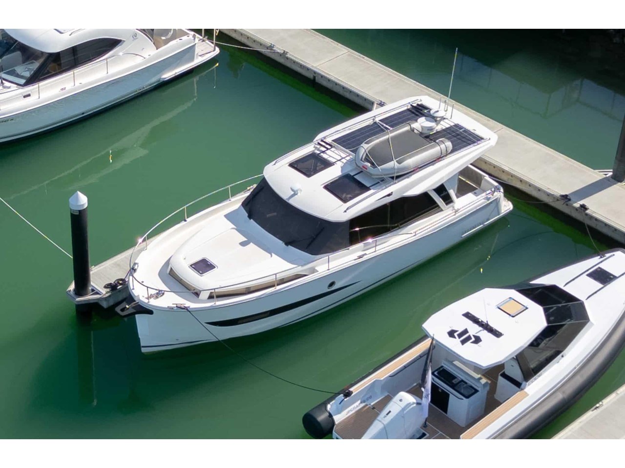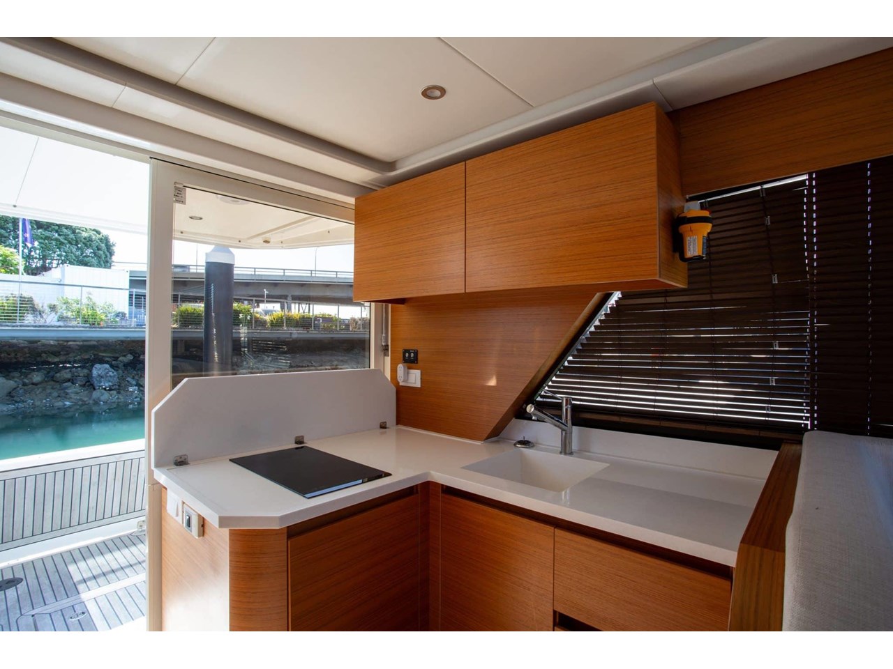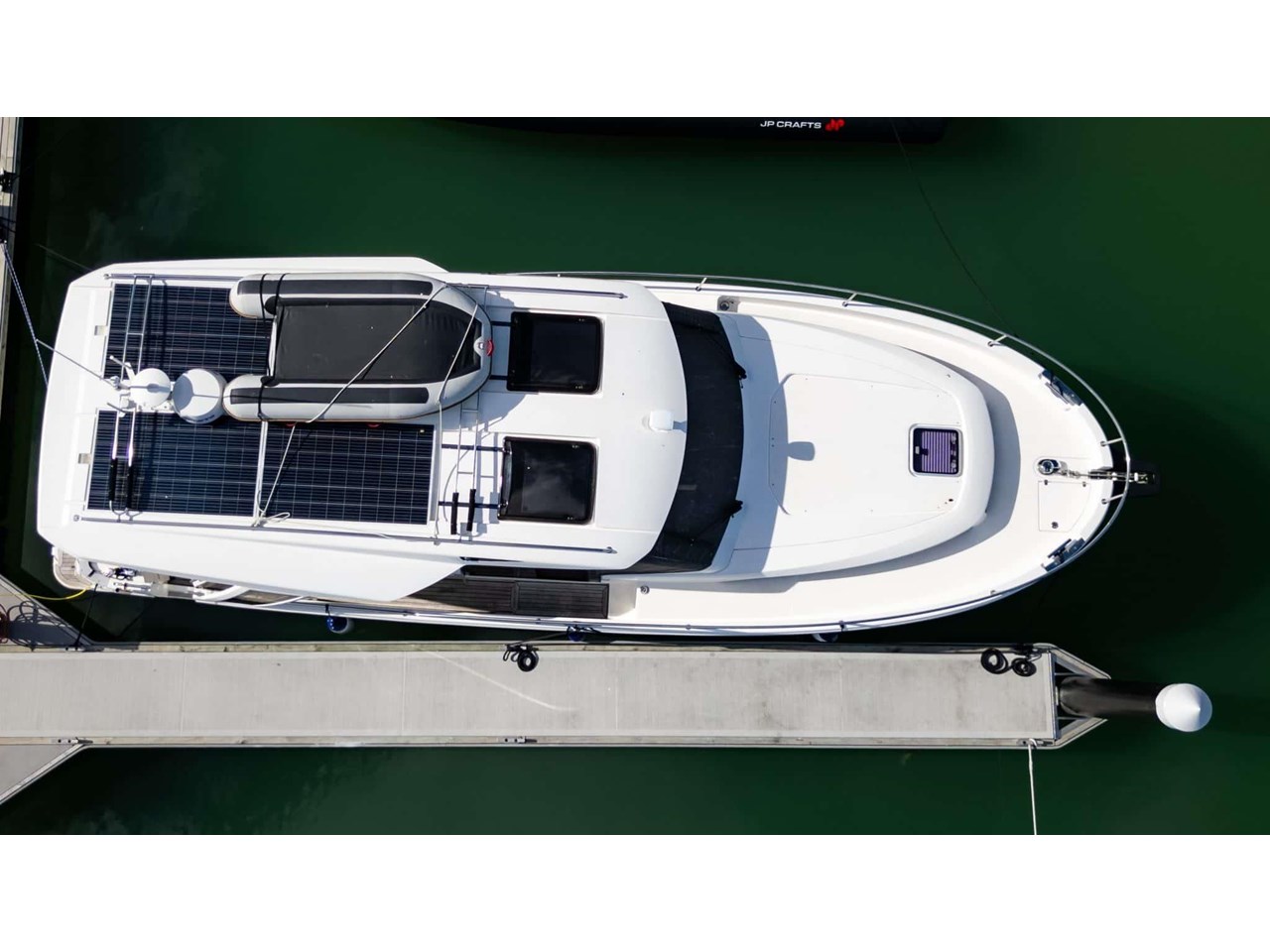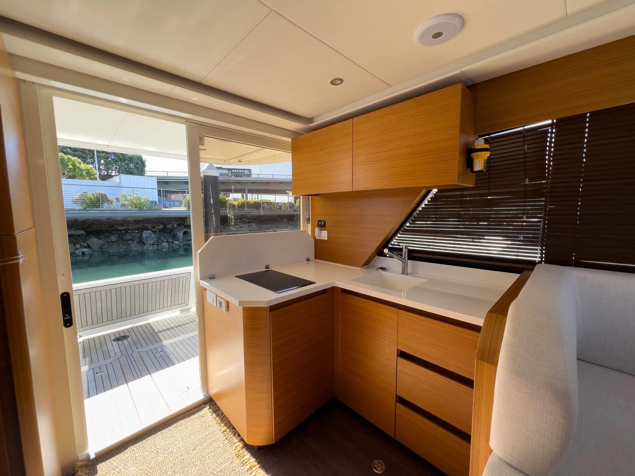 Step inside to find a bright and airy interior, where large wraparound windows flood the space with natural light. Clever design elements maximize functionality, including a folding benchtop that transforms into a bar, a lowering transom that serves as a swim platform, and abundant storage options throughout the vessel.