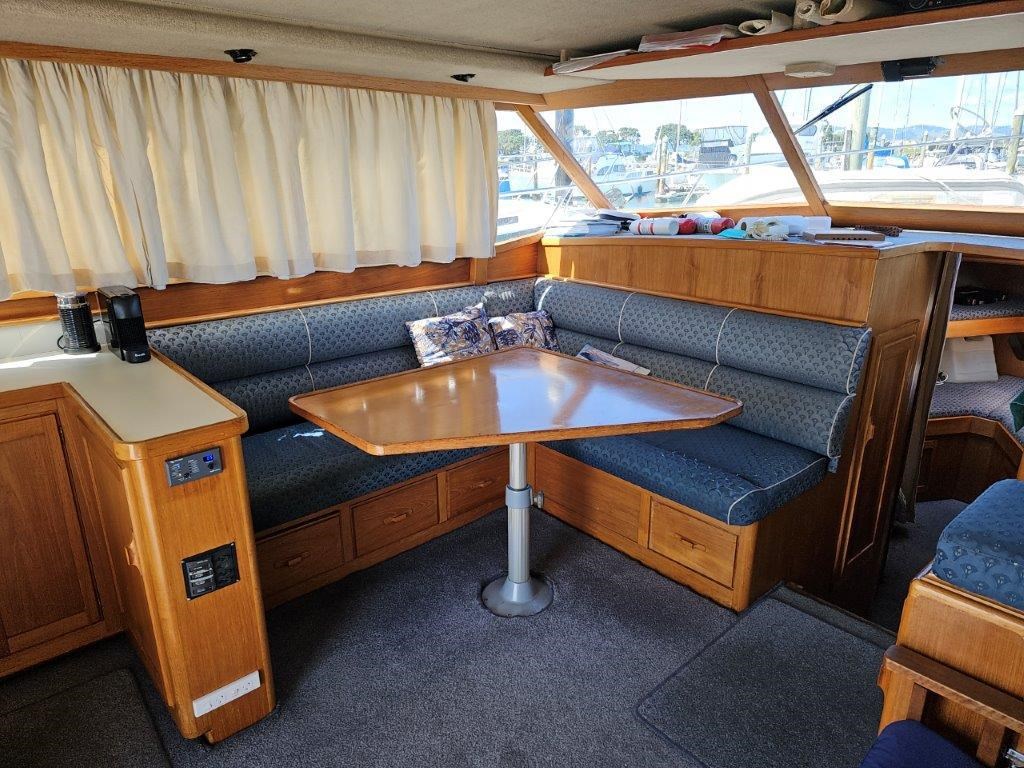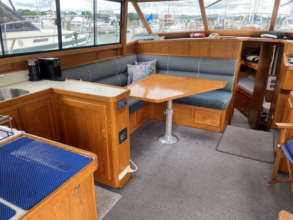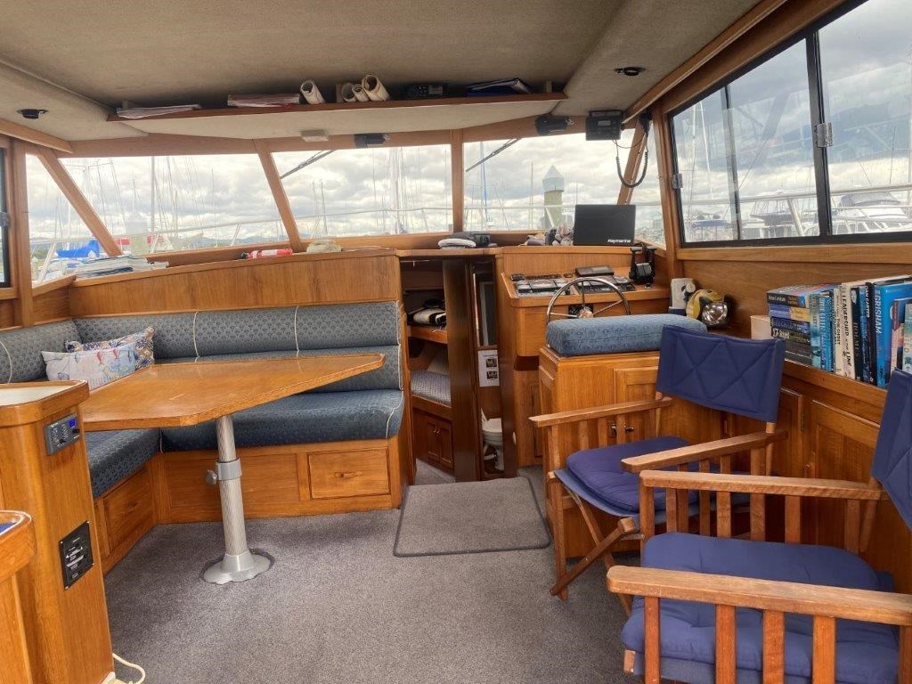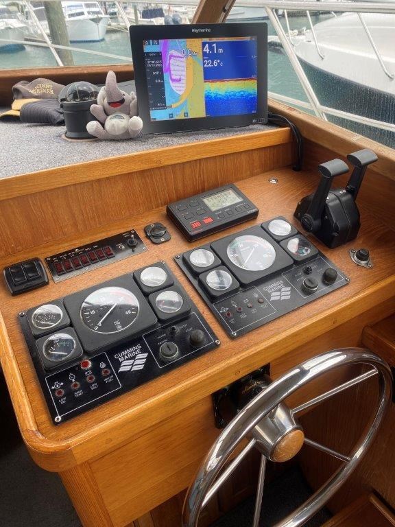 The Kennedy 11m (1995) is a robust and spacious timber-hulled powerboat built by the Wooden Boat Company, featuring a triple diagonal Kauri glassed over construction. Powered by twin Cummins 6BT 210hp diesel engines with shaft drive, it offers a comfortable cruising speed of 12 knots and a top speed of 21 knots. This vessel boasts a generous 11.3m length overall and a 3.9m beam, providing ample space with two cabins including a master cabin with a double bed and a forward cabin with four bunk beds. The modern enclosed flybridge is equipped with advanced navigation electronics such as Raymarine Axiom, autopilot, and VHF radio. Additional amenities include a large dinette, aft galley with gas hob, grill, and oven, stainless steel tanks for fuel and freshwater, a lithium-ion house battery bank with Victron inverter charger, and a teak cockpit with swim platform. Ideal for those seeking a big volume twin cabin boat with modern features and excellent value, the Kennedy 11m is perfect for comfortable cruising and extended stays on the water.