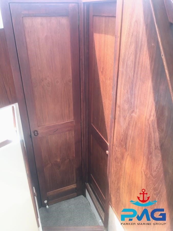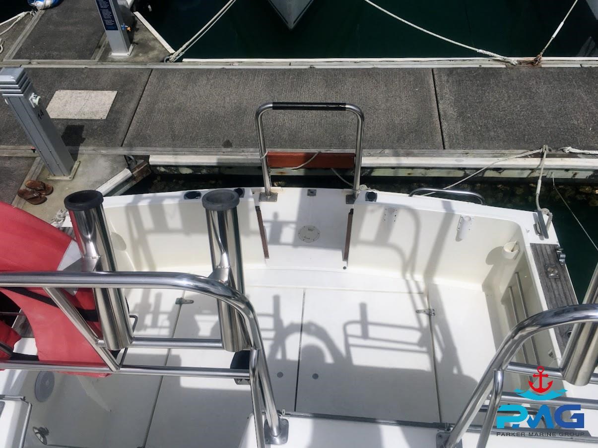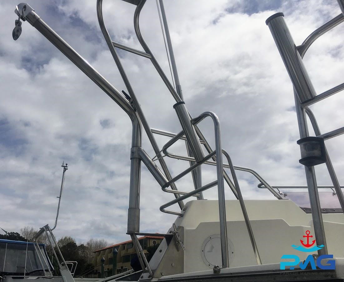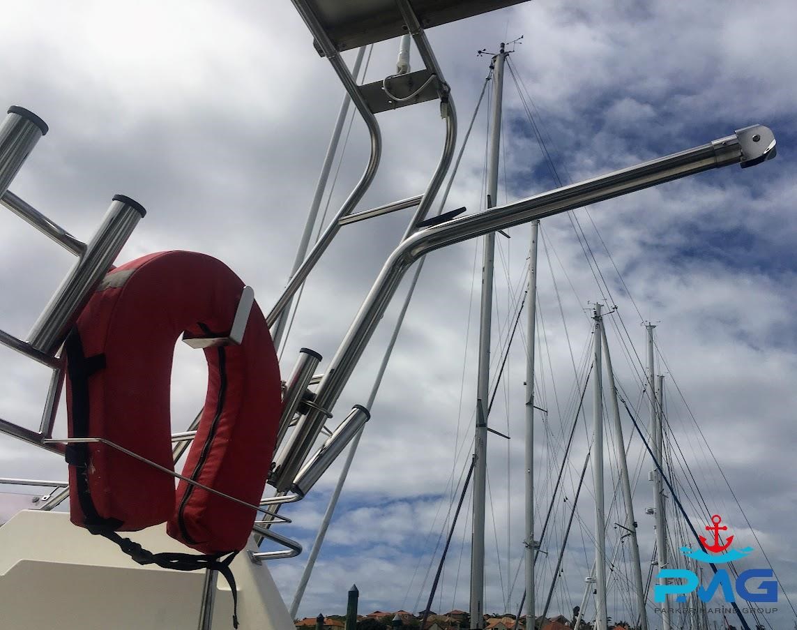 - Custom fabricated slewing Dinghy davits (above Cockpit), ideal for long trips or maximizing duckboard space.