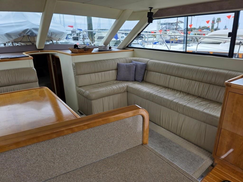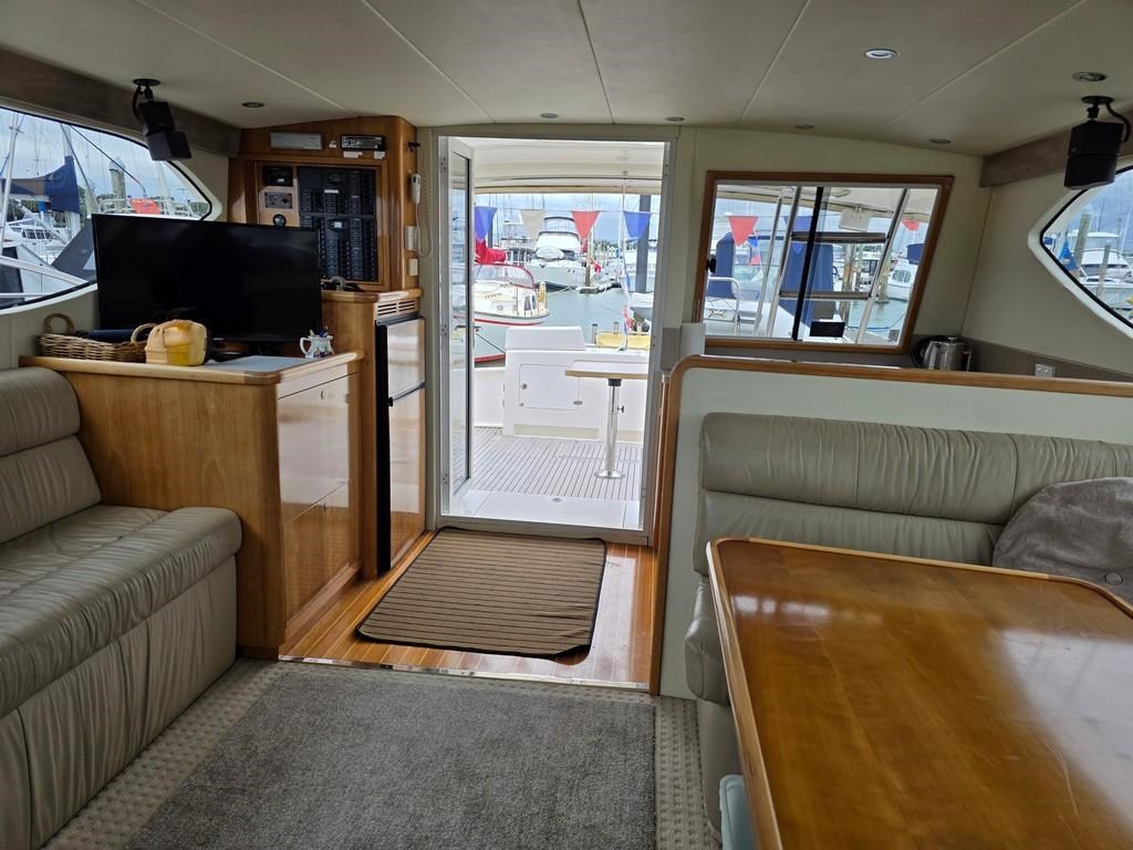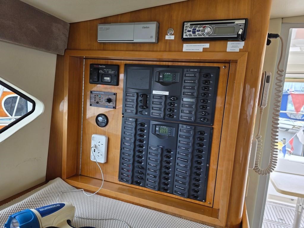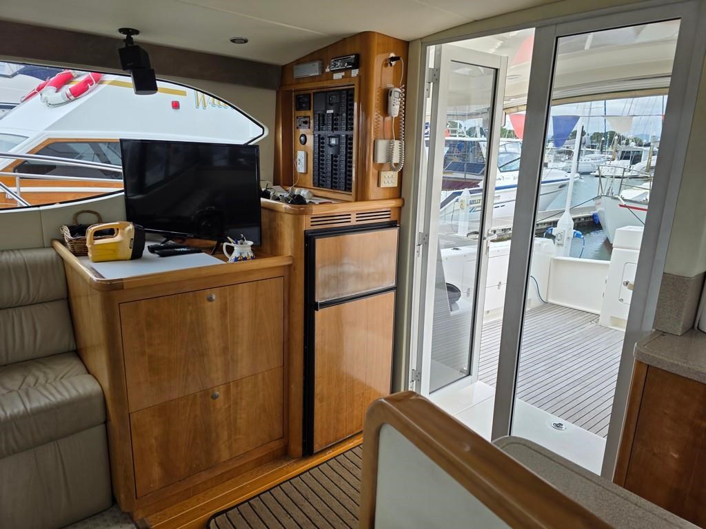 The Mustang 43 Flybridge Cruiser (2007) is a versatile and spacious powerboat perfect for family cruising and big game fishing. Measuring 14.15 meters in length with a 4.61-meter beam and a 1-meter draft, this fibreglass vessel offers a robust GRP construction and weighs approximately 18 tonnes when laden. Powered by twin Cummins QSC 500hp diesel engines with shaft drive, it delivers a comfortable 21-knot cruise speed and a top speed exceeding 27 knots. The boat features an enclosed flybridge, bow thruster, and a well-equipped galley with modern appliances including a dishwasher and multiple fridges/freezers. Accommodation includes two cabins with an island bed and ensuite, a guest cabin with two single beds, and convertible sleeping areas in the saloon and flybridge. Additional amenities include Furuno Navnet navigation systems with autopilot and radar, a Victron charger/inverter, an 11.5 KVA Onan generator, and fishing gear such as game poles and a live bait tank. This Mustang 43 has been meticulously maintained by its original NZ owner and is in fantastic condition, making it an excellent choice for both leisure and sport fishing enthusiasts.