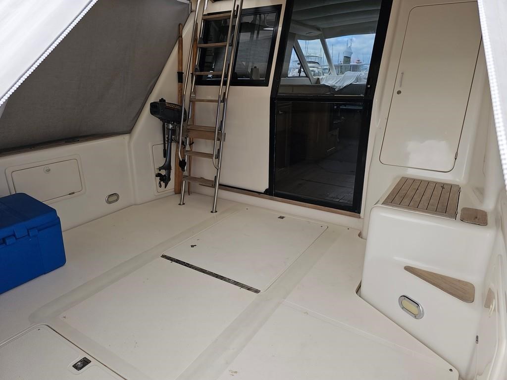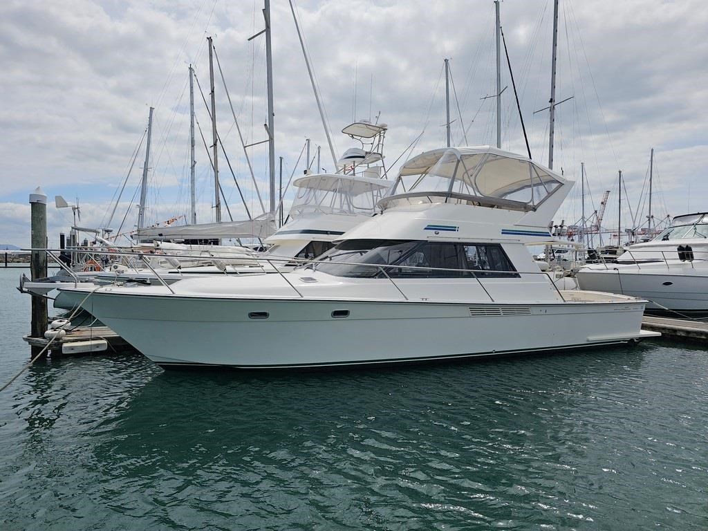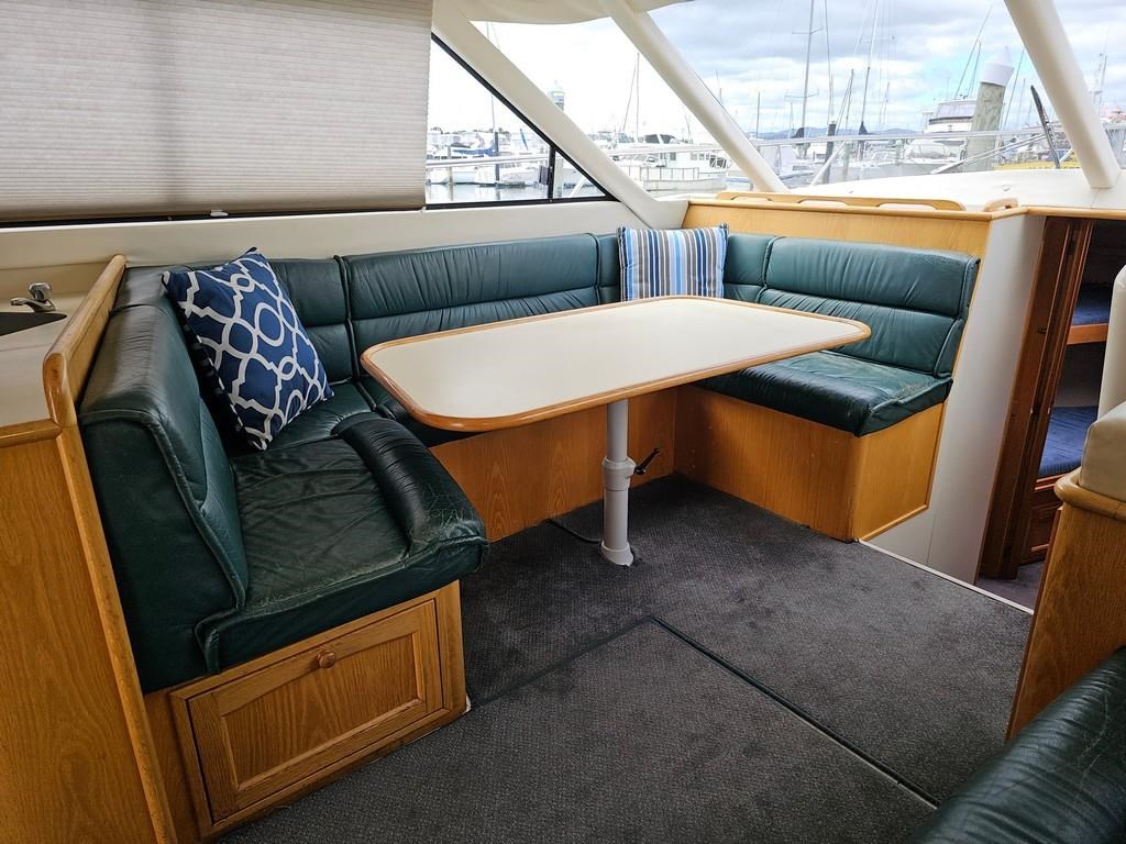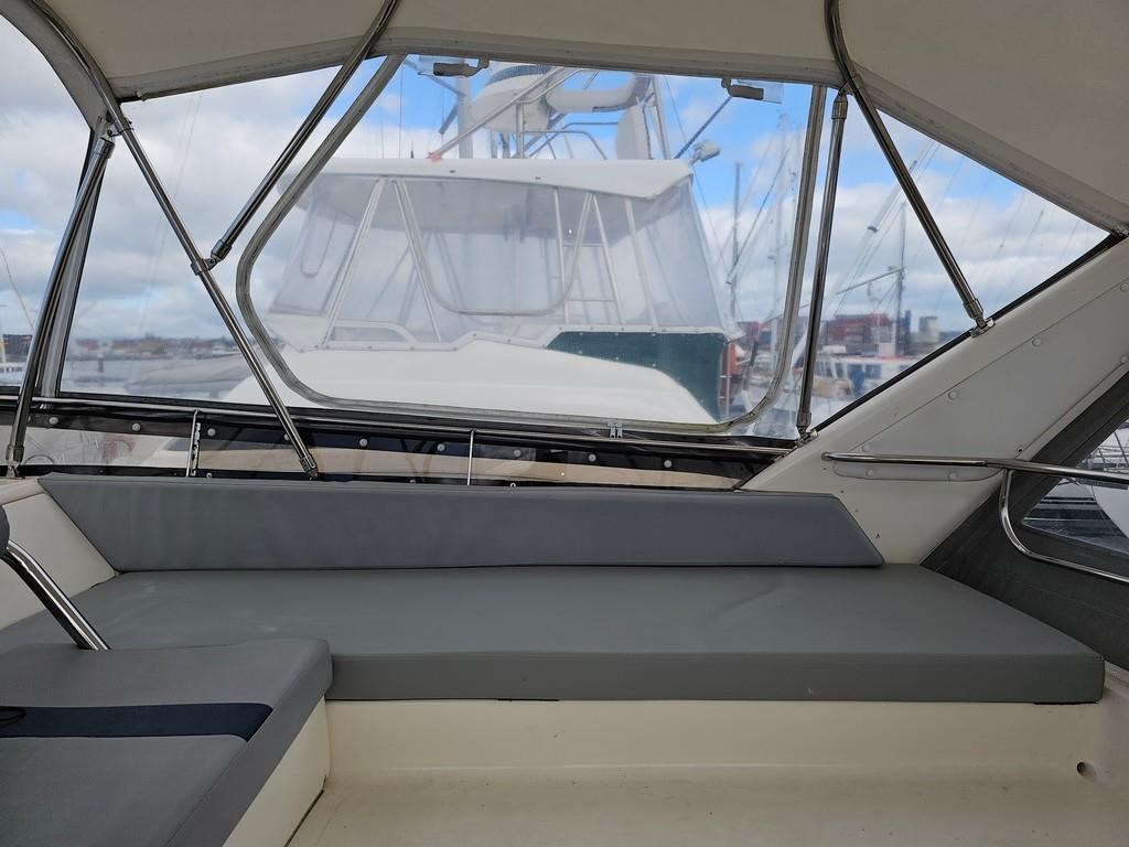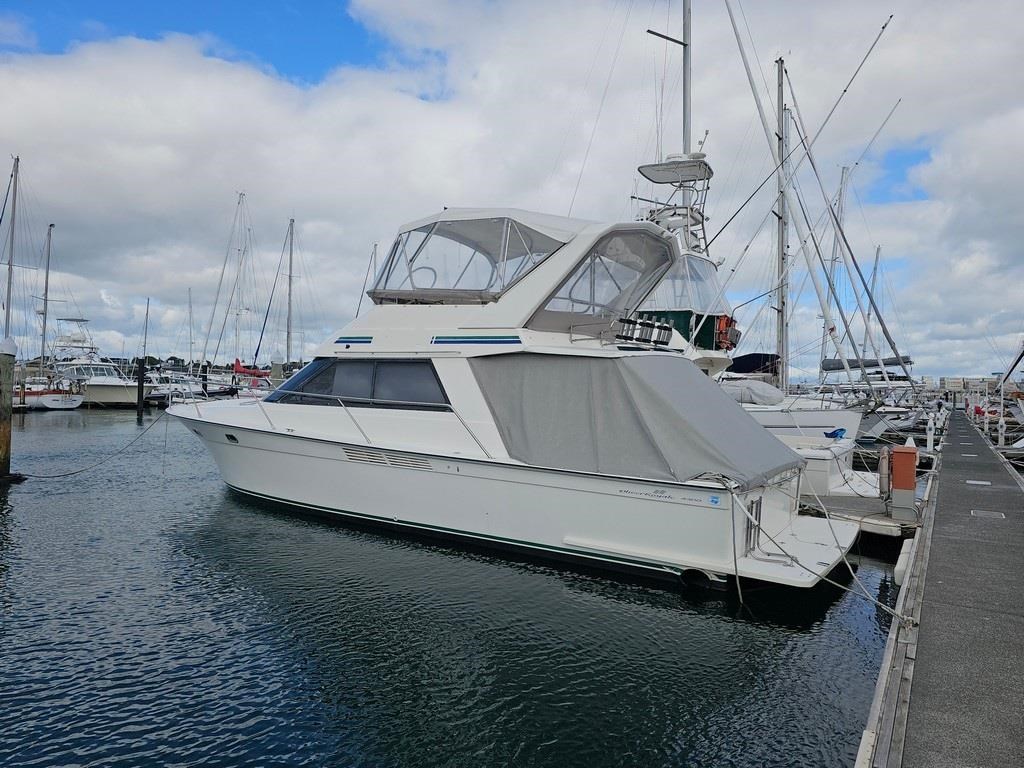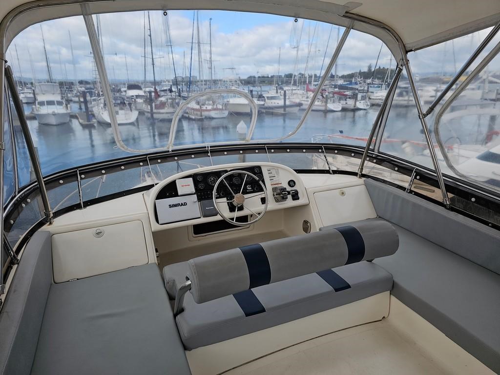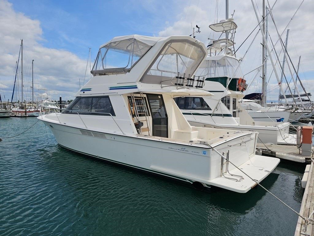 The Oliver Royale 4300 (1997) is a spacious and well-equipped 13.2m fibreglass powerboat, perfect for comfortable cruising. Powered by twin Cummins 315hp diesel engines with shaft drive, it offers a smooth and efficient ride with a cruising speed of 15 knots and a top speed of 26 knots. The vessel features a robust GRP construction, a 4.1m beam, and a shallow 1.1m draft, making it versatile for various waters. Accommodation includes two cabins with a master double bed and forward V-berth bunks, plus a lock-up shower and toilet. The saloon boasts leather seating and a pull-out couch, while the aft galley is equipped with a 2-burner gas hob, oven, and fridge. Navigation is enhanced with Simrad and Furuno displays, autopilot, and digital controls at both lower helm and flybridge stations. Additional amenities include an Eberspacher diesel heater, large cockpit with teak combings, live bait tank, freezer, and dinghy holder. With recent engine servicing and upgrades, this Oliver Royale 4300 represents excellent value and readiness for immediate use. Contact Tauranga Boat Sales for viewing and more information.