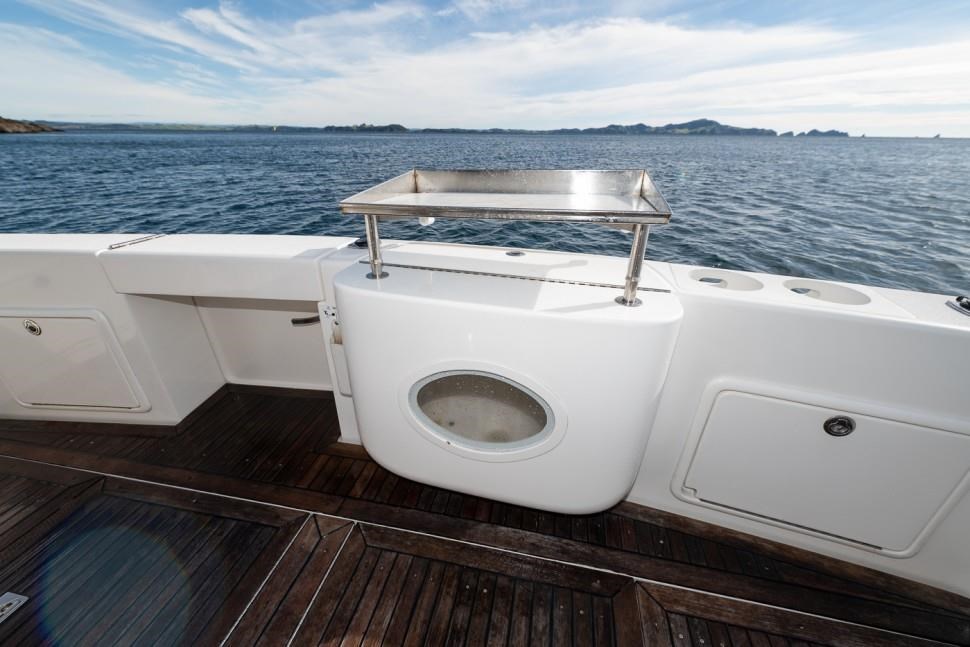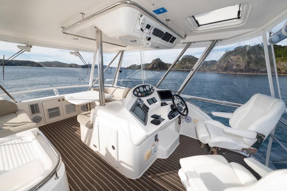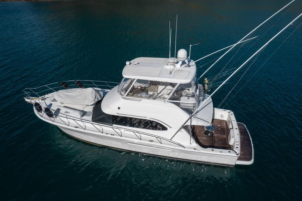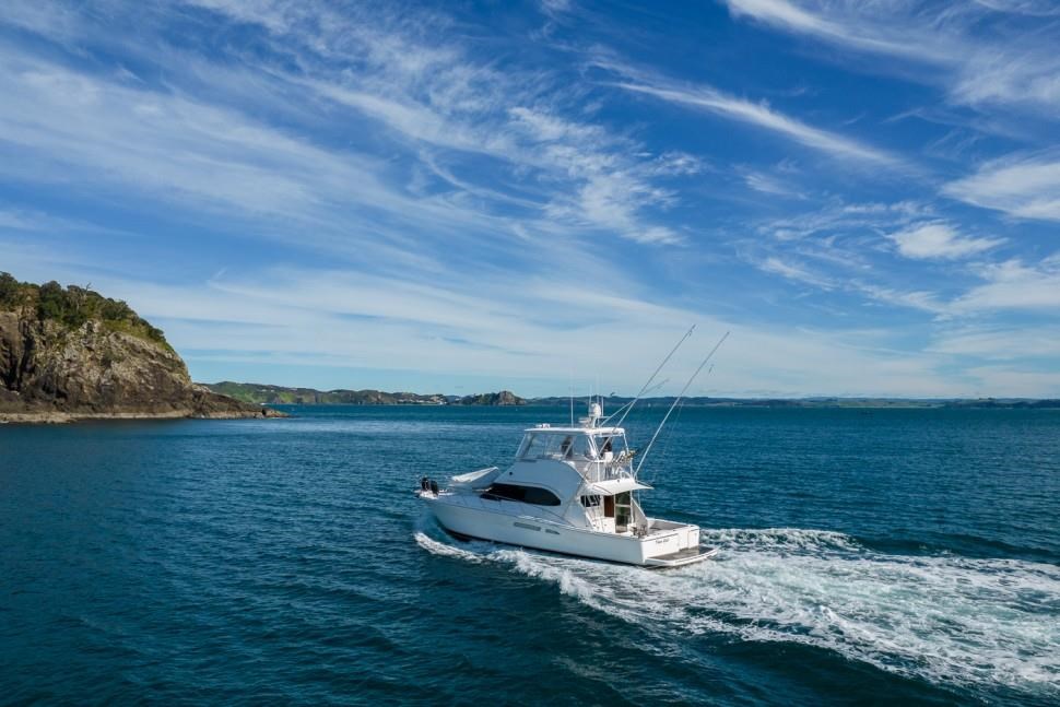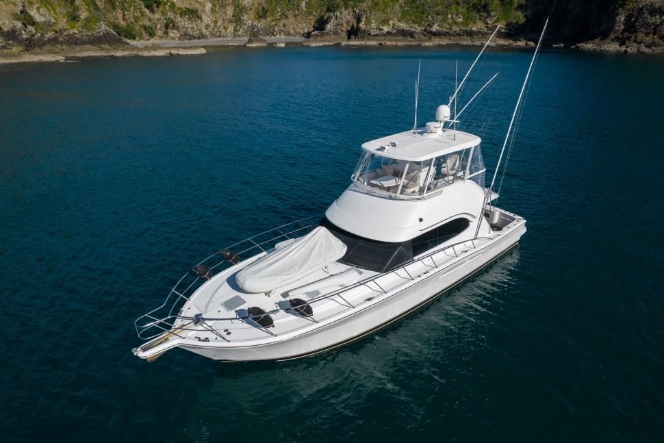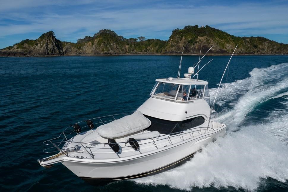 Discover the Riviera 47 G2, a luxurious and highly capable flybridge cruiser offered for sale in the beautiful Bay of Islands. This Generation II Riviera 47, one of only 292 built, features a unique tunnel hull design for enhanced efficiency and an underwater exhaust system to reduce noise, making it perfect for offshore cruising. Powered by twin Cummins QSM11 engines delivering 660hp each, it offers an economical 21-knot cruise speed and can reach up to 28 knots. The vessel boasts a bow thruster and trim tabs for superior handling in all conditions. Inside, enjoy a spacious entertainer's saloon with an L-shaped lounge, dinette for five, and a fully equipped galley with modern appliances. The enclosed flybridge includes an aft helm with Raymarine electronics, wet bar, air conditioning, and ample seating, ideal for socializing or relaxing. Whether for game fishing, family cruising, or entertaining at anchor, this Riviera 47 G2 is turnkey and ready for your next adventure in New Zealand waters.