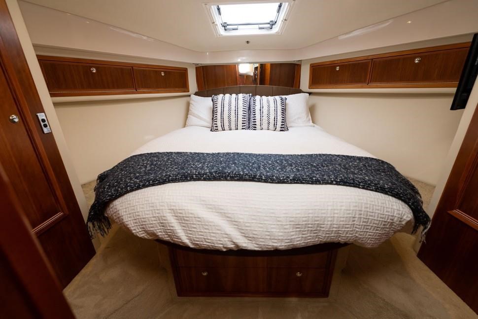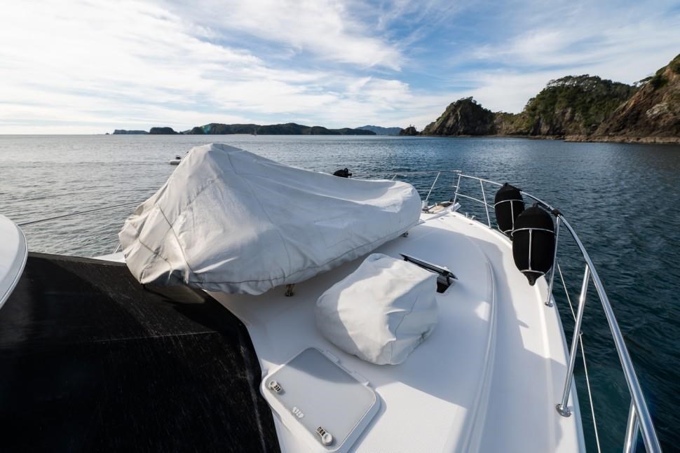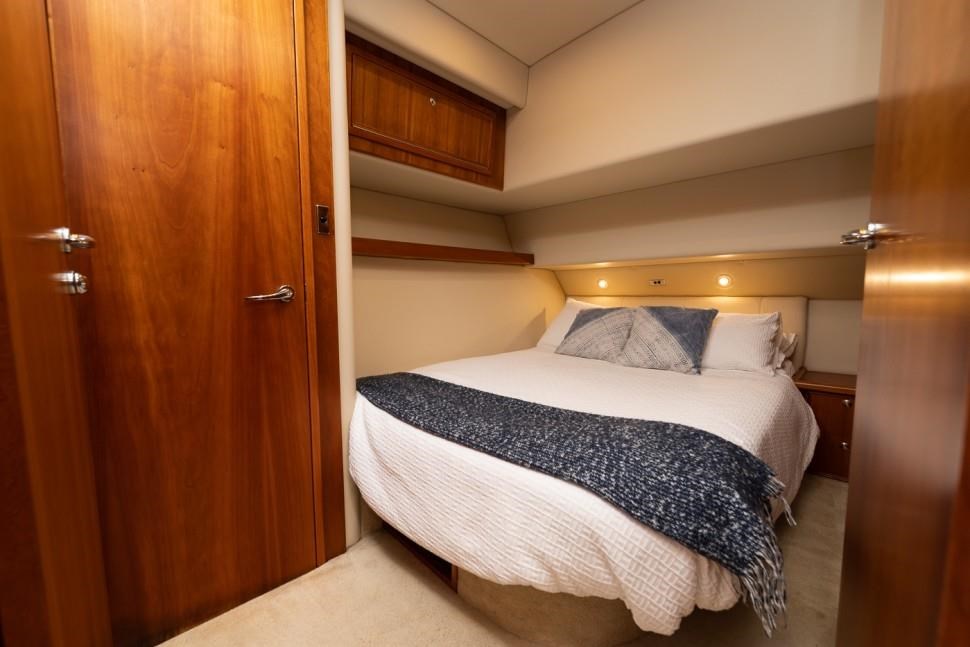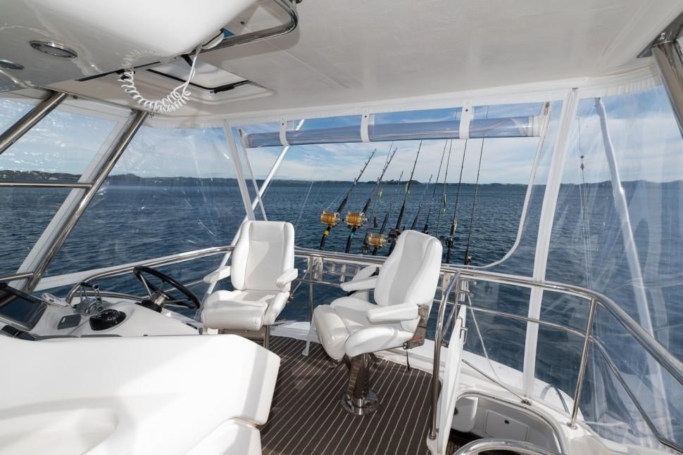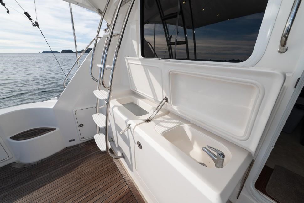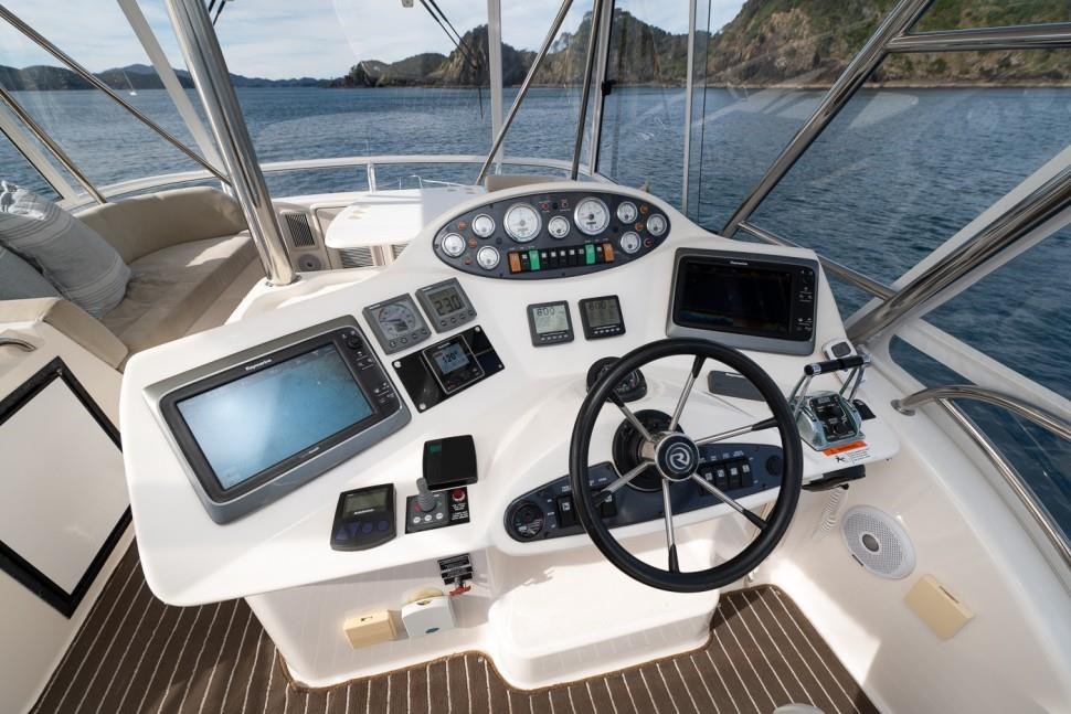 Discover the Riviera 47 G2, a luxurious and highly capable flybridge cruiser offered for sale in the beautiful Bay of Islands. This Generation II Riviera 47, one of only 292 built, features a unique tunnel hull design for enhanced efficiency and an underwater exhaust system to reduce noise, making it perfect for offshore cruising. Powered by twin Cummins QSM11 engines delivering 660hp each, it offers an economical 21-knot cruise speed and can reach up to 28 knots. The vessel boasts a bow thruster and trim tabs for superior handling in all conditions. Inside, enjoy a spacious entertainer's saloon with an L-shaped lounge, dinette for five, and a fully equipped galley with modern appliances. The enclosed flybridge includes an aft helm with Raymarine electronics, wet bar, air conditioning, and ample seating, ideal for socializing or relaxing. Whether for game fishing, family cruising, or entertaining at anchor, this Riviera 47 G2 is turnkey and ready for your next adventure in New Zealand waters.