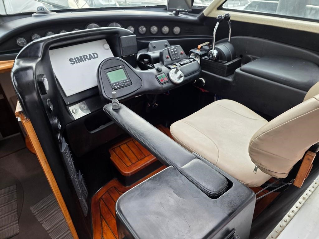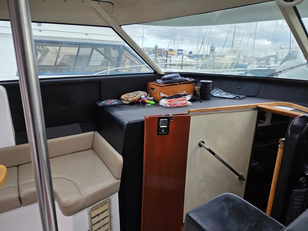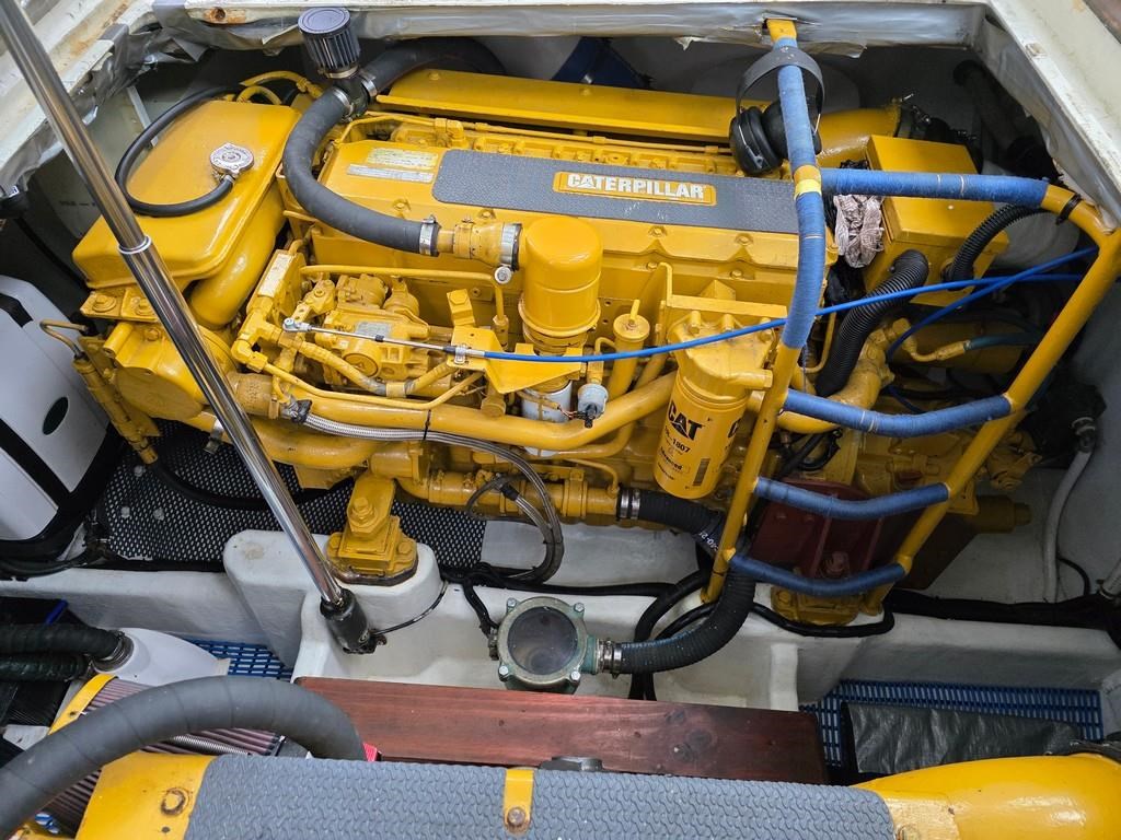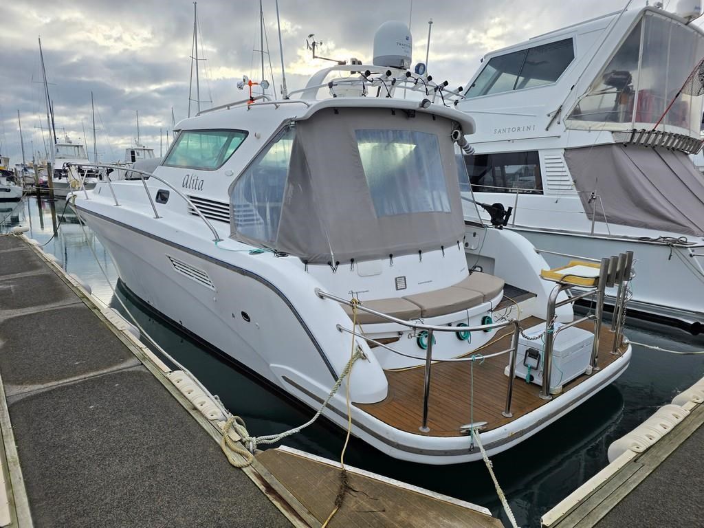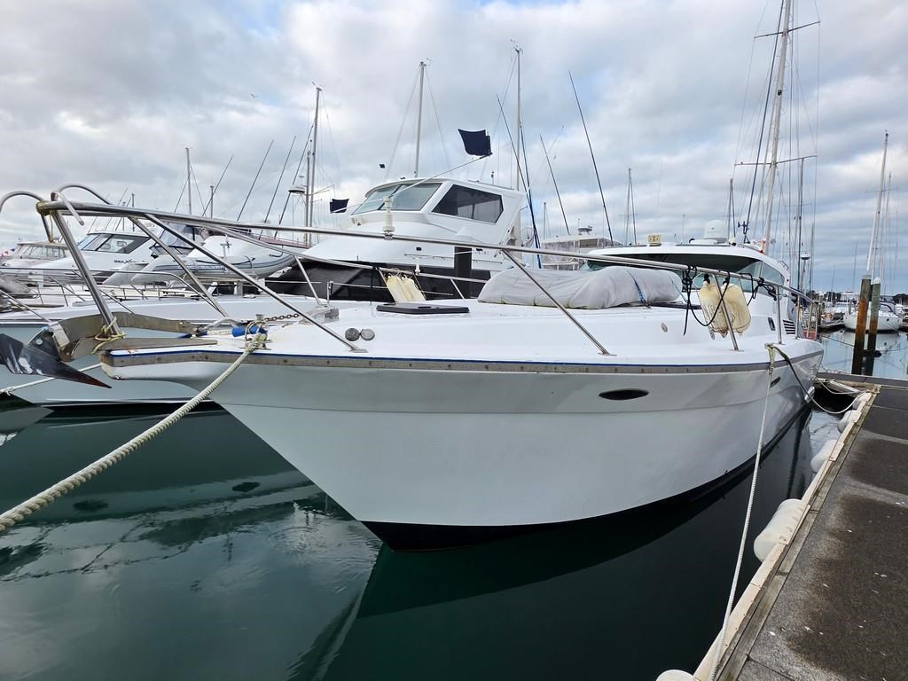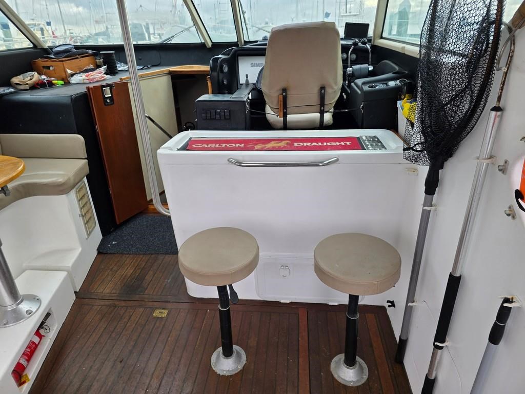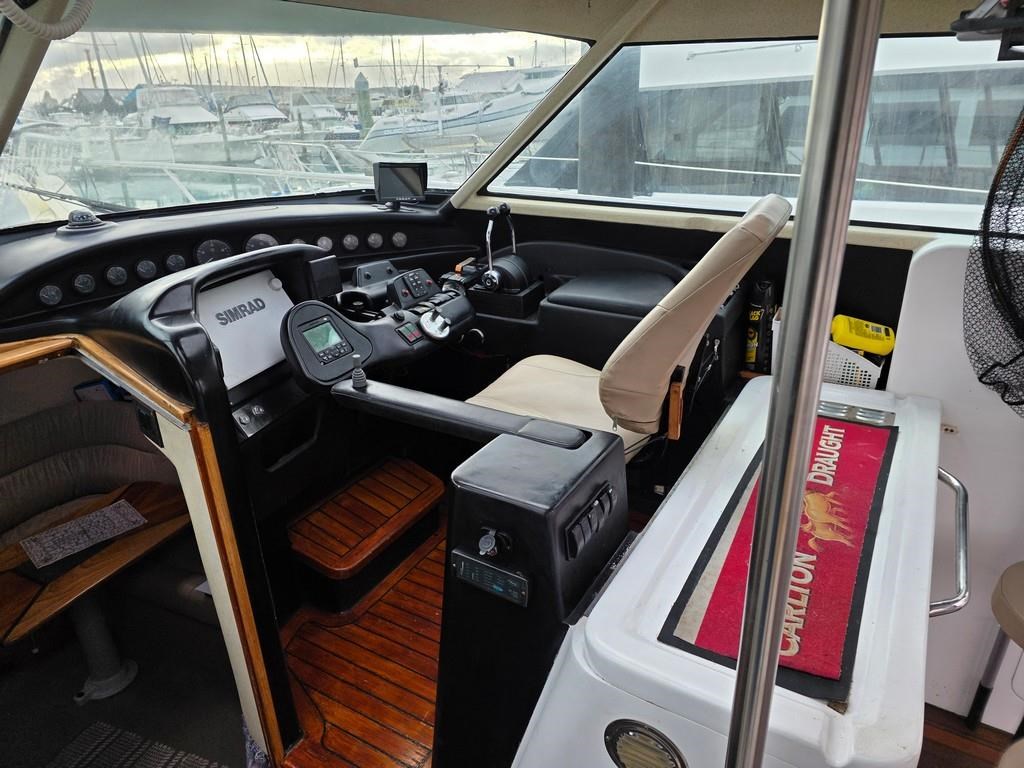The Fortron 40 Sedan (2004) is a robust and well-designed power boat featuring a fibreglass hull, built for both comfort and performance. Powered by twin Caterpillar 3116 diesel engines delivering 275hp each, this vessel offers a reliable twin shaft drive system with approximately 7800 engine hours. It cruises comfortably at 12 knots with a top speed of 23 knots. The spacious layout includes a swim platform with stainless steel railing and bait board, aft couching, cockpit covers, and a well-equipped galley with modern appliances such as a wine cooler, fridge, microwave, and 2-burner hob. The helm station is advanced with joystick steering, bow and stern thrusters, trim tabs, autopilot, and a 12" Simrad display with radar and electronic capstan. Accommodation features a lock-up cabin with an island bed, a single aft saloon bed, and a lock-up shower/toilet, making it ideal for extended cruising. This New Zealand-built fibreglass sedan combines practical amenities with strong performance, perfect for boating enthusiasts seeking a versatile and comfortable power cruiser.