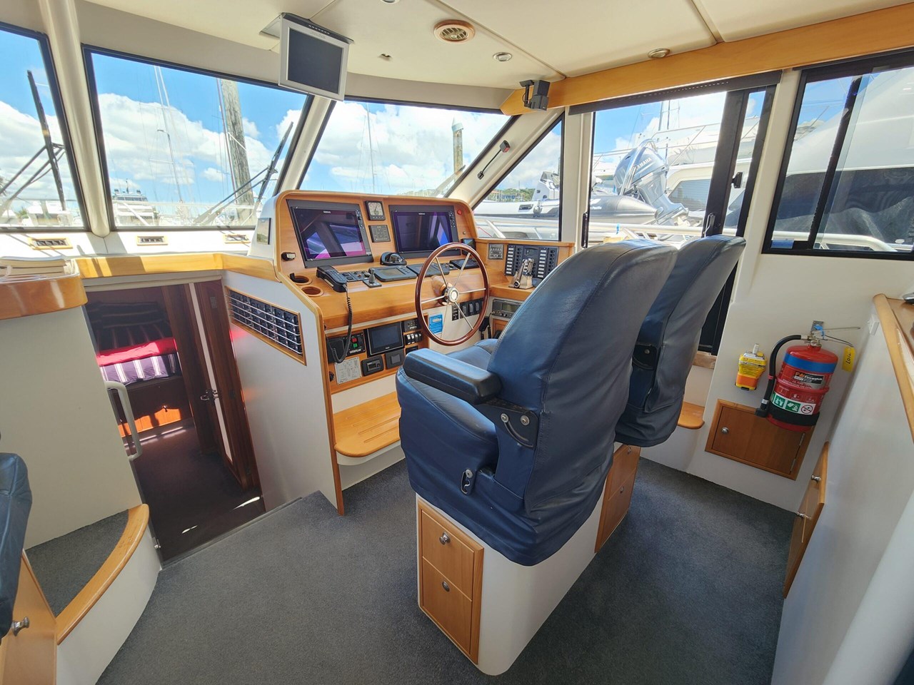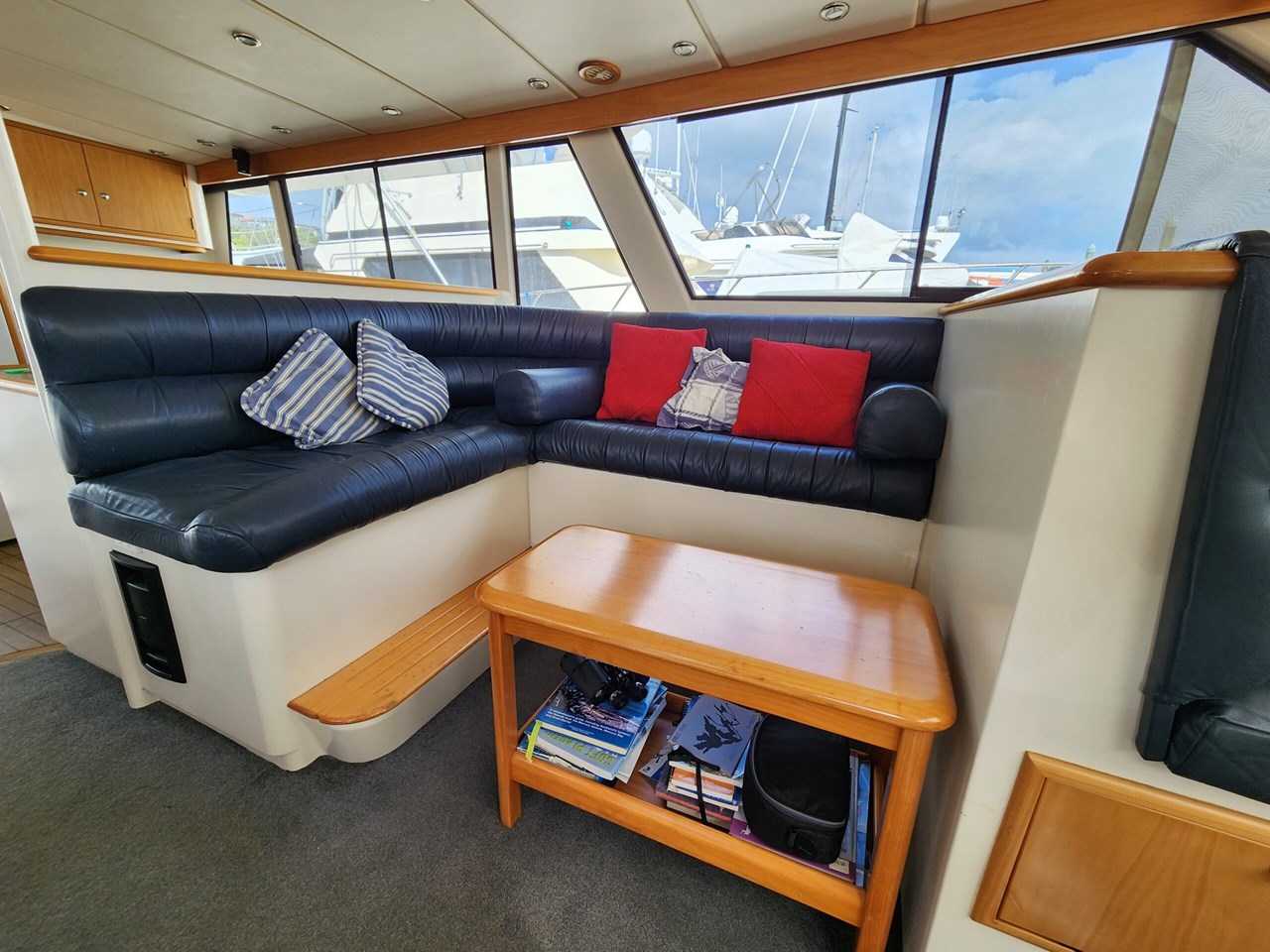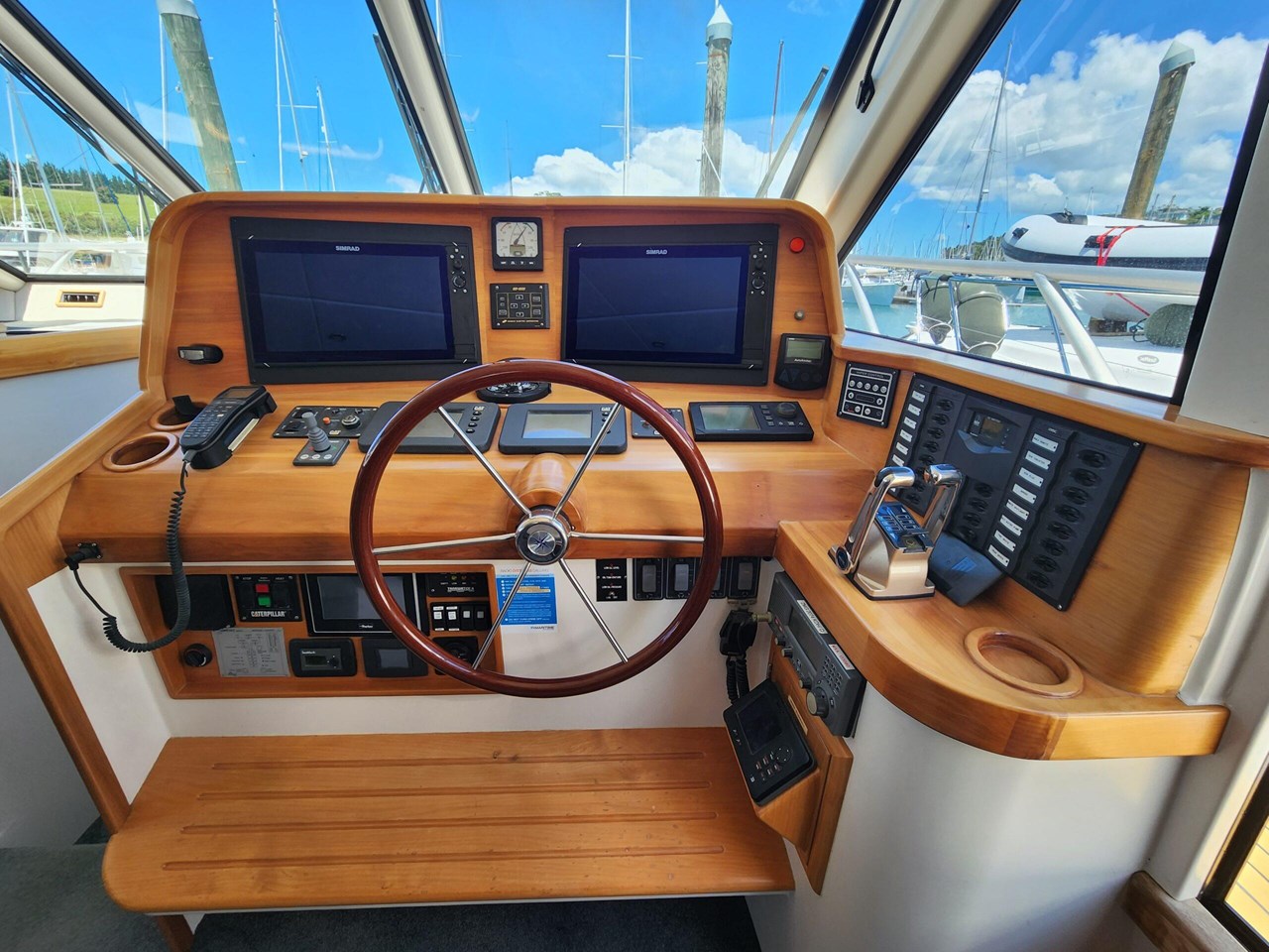 Cruising speed of 12-16knots with the ability to sprint at 24 knots thanks to her twin Caterpillar C12 engines. Each of her three helm stations are equipped with a bow thruster control for easy handling and the latest Simrad displays for navigation.